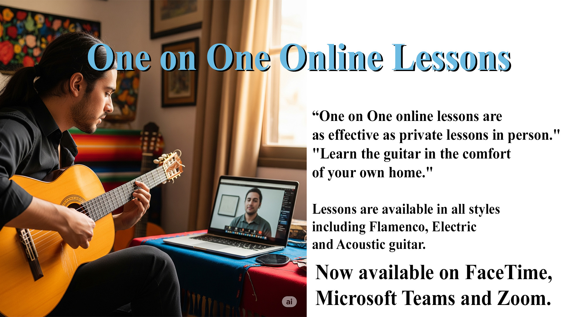 Online private lesson to learn guitar in the comfort of your own home and avoid commute time. Now available on Microsoft Team and Zoom.